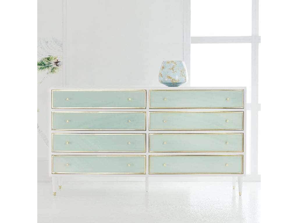 Product Description: Somerset Bay SBT487 Seaglass Dresser - The Seaglass Dresser from Somerset Bay features a white painted mahogany body and eight dovetail soft-close drawers. The drawer fronts are finished in printed acrylic seaglass. With brass accent trim and foot caps, and brass hardware pulls.