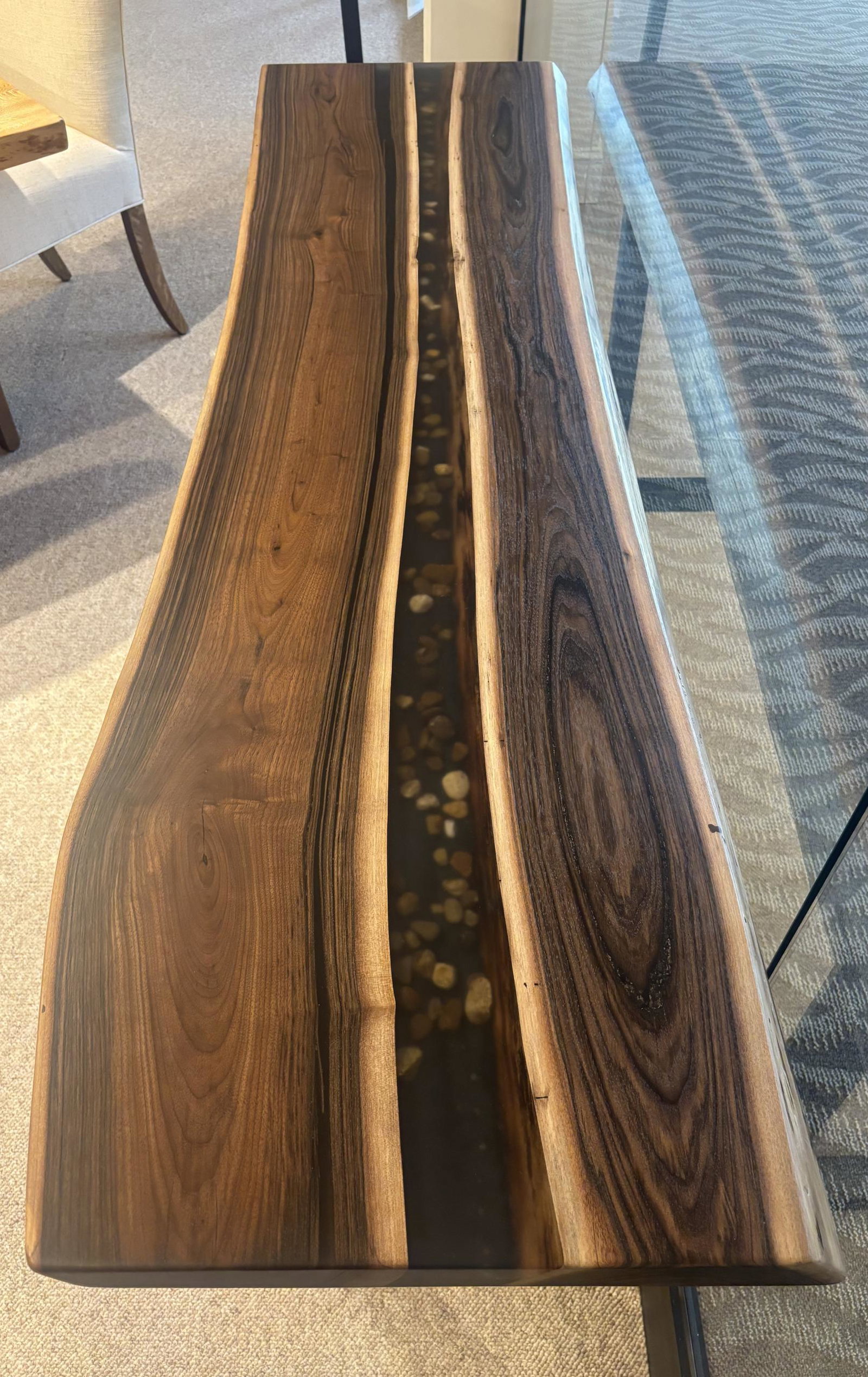 Product Description: Still Fork CUSTOMRIVER Walnut Live Edge Console - Walnut with River Rocks Epoxy