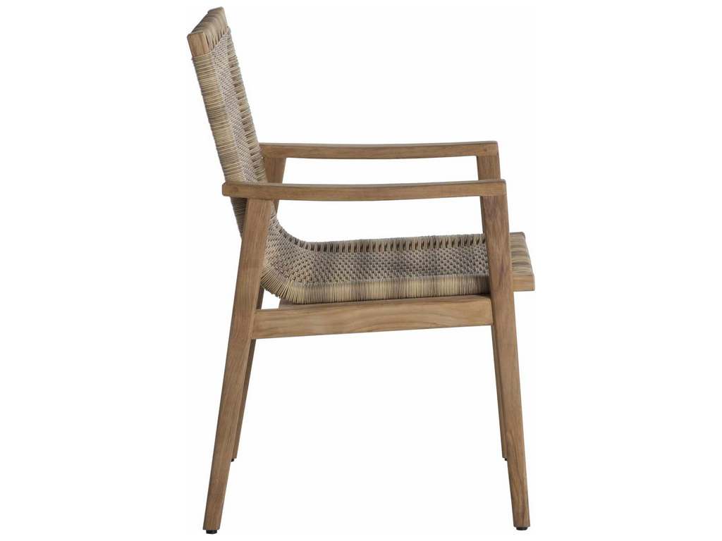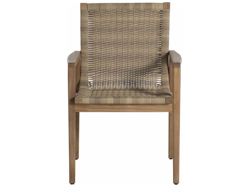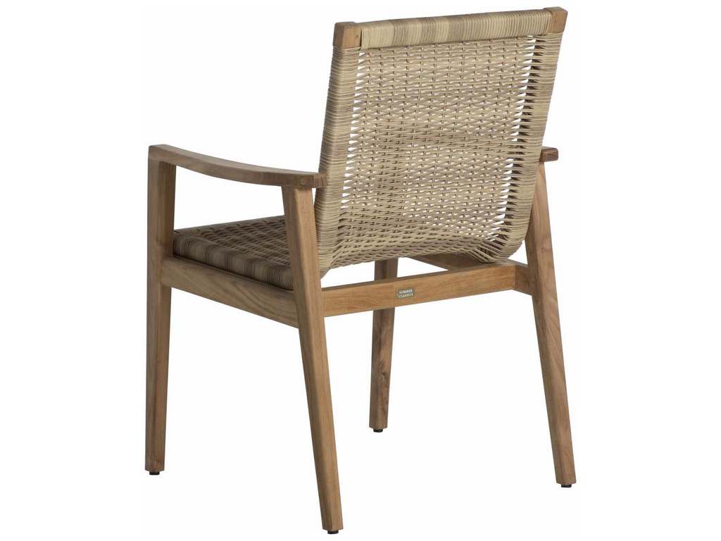 Product Description: Summer Classics 1307 Pointe Dining Arm Chair - The Pointe Dining Arm Chair with a natural teak frame and wicker seat in a raffia finish is built for worry-free enjoyment given the echo-friendly and weather-resistant attributes of marine-grade teak and UV-resistant resin wicker from which it is made. Inspired by mid-century modern design, the outdoor dining chair has solid teak frames with mortise and tenon joinery. The subtle curves and shaping on the arms set the patio dining chair apart. The cushions are available in Dream only.