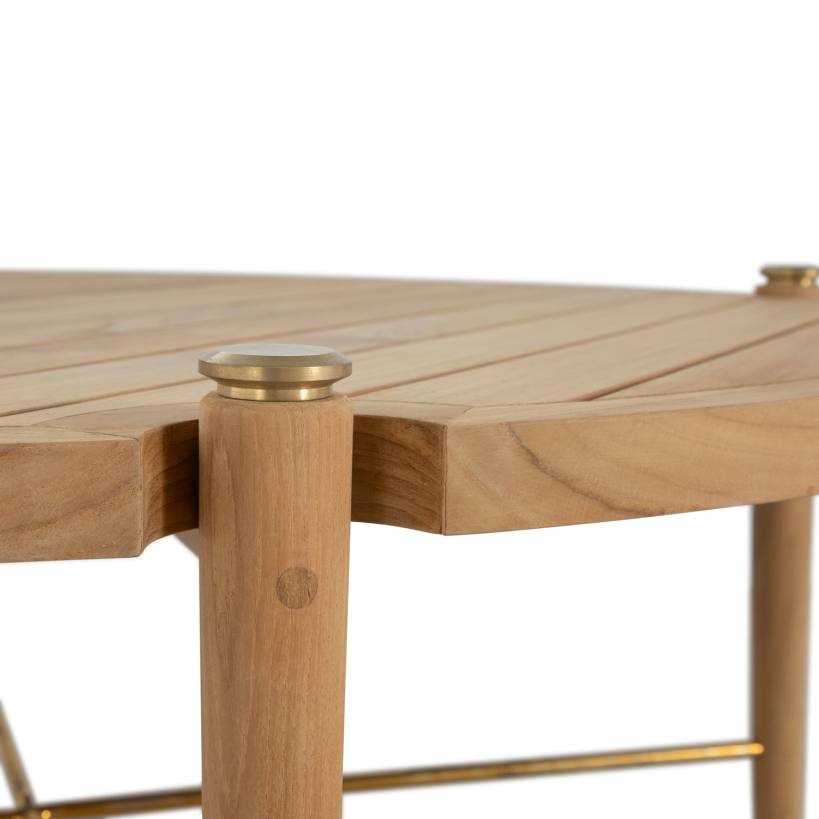 Product Description: Summer Classics 1453 Pacifica Coffee Table Round - The Pacifica End Round Table enriches outdoor spaces by exemplifying the unmatched elegance and durability of some of the world's finest teak. The unfinished brass accents on the leg extensions add a touch of sophistication, designed to beautifully patina over time, enhancing the tables' aesthetic appeal with a lived-in, vintage charm. The tabletops are thoughtfully slated, promoting efficient water drainage and making them perfectly suited for outdoor environments. Please note, that due to its high-quality center cut, and natural oils, teak will age gracefully without the help of cleaners and protectors.