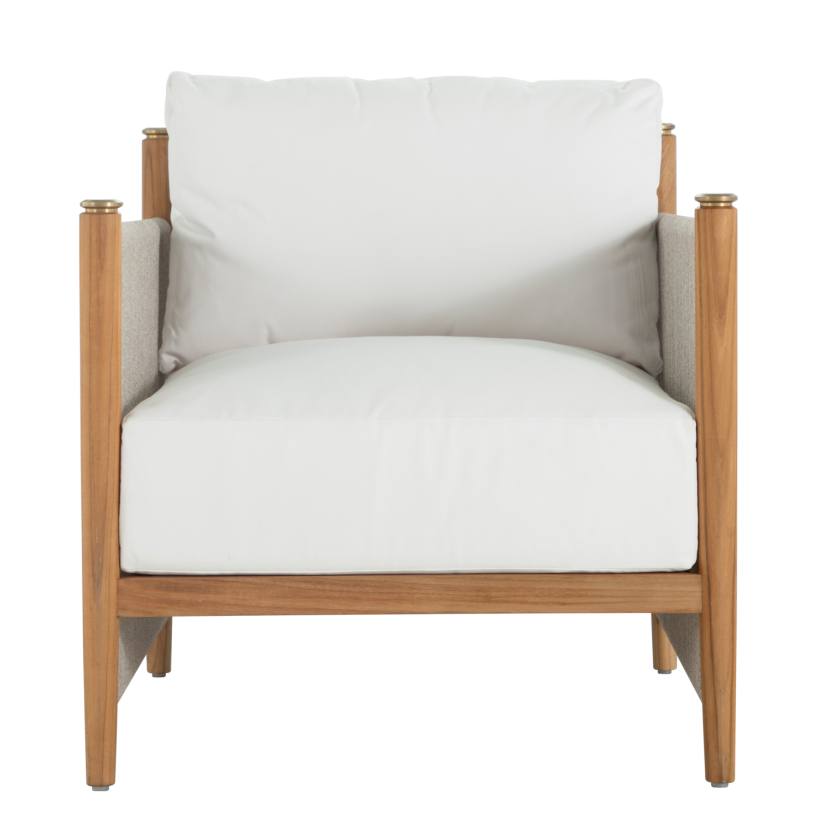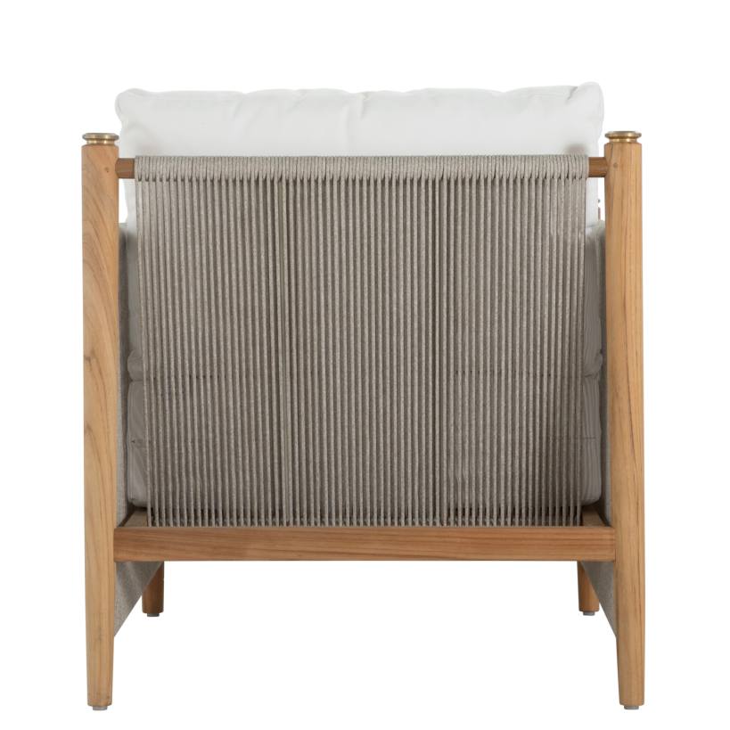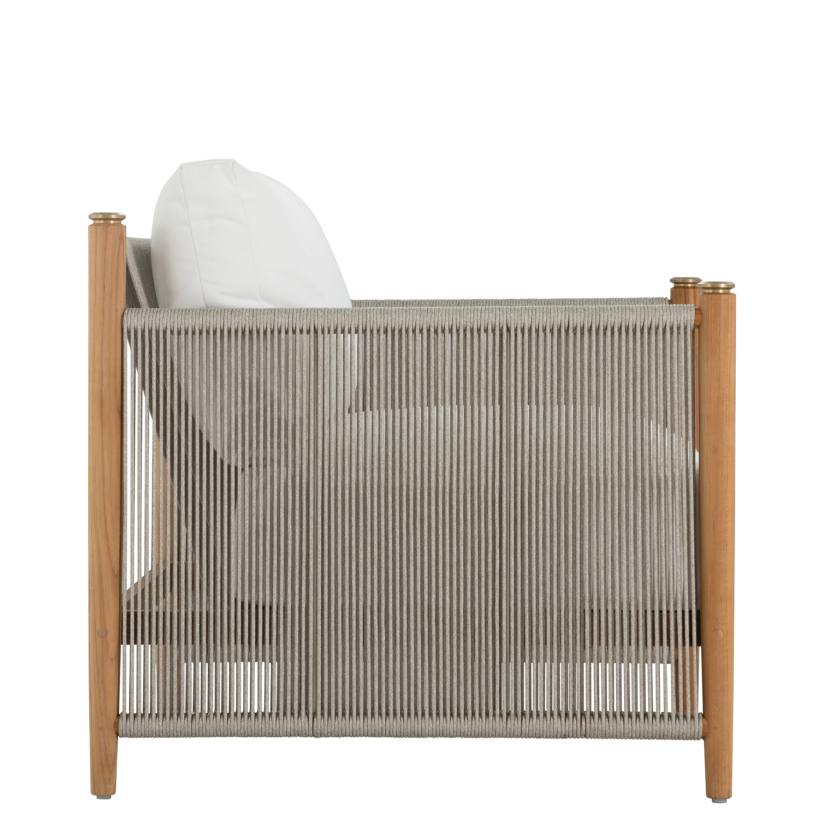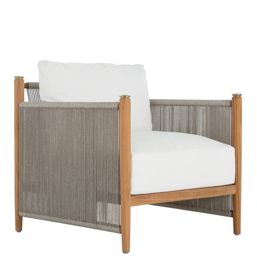 Product Description: Summer Classics 1455 Pacifica Lounge - The Pacifica Lounge Chair marries modernity and natural beauty, featuring a teak frame with vertical olefin rope, known for its durability and weather-resistance, and brass toppers destined to patina beautifully. Plush cushions enhance comfort, while the unique rope back offers support and style. This collection, designed for durability promises longevity, weather resistance, and minimal maintenance. Please note, that due to its high-quality center cut, and natural oils, teak will age gracefully without the help of cleaners and protectors.
