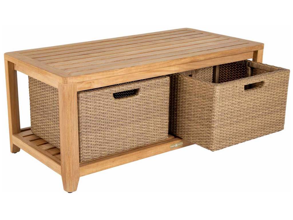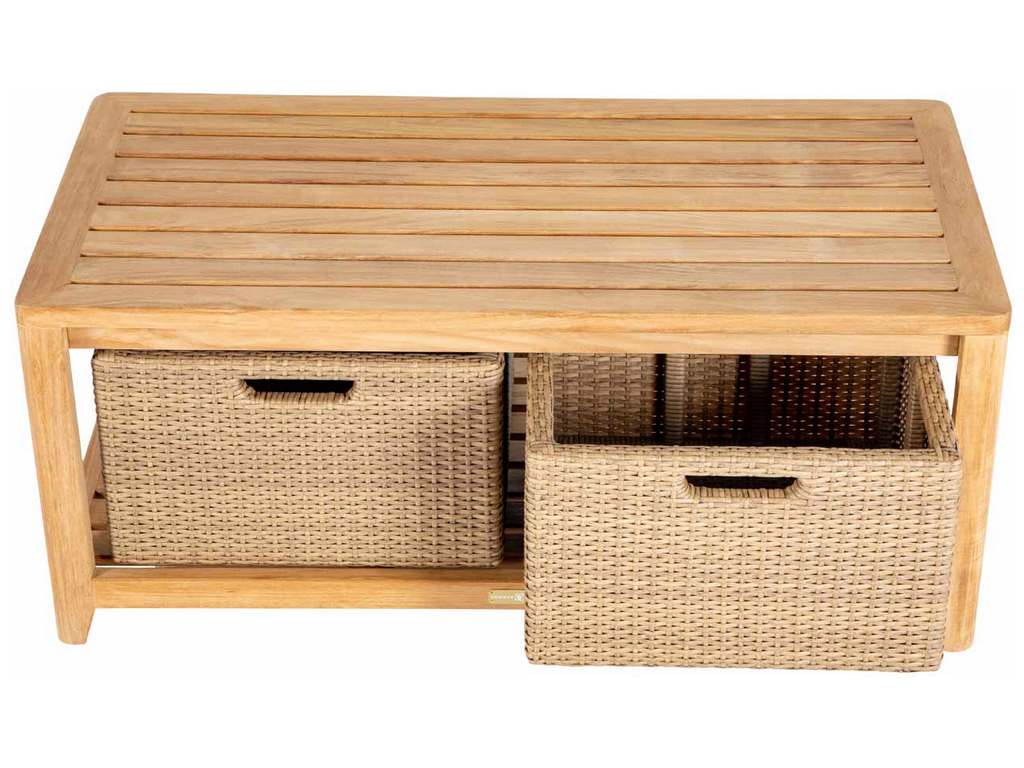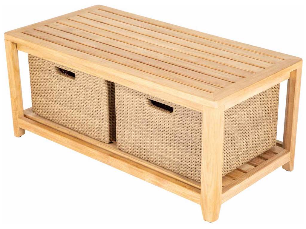 Product Description: Summer Classics 2911 Chesapeake Storage Coffee Table - Summer Classics expands its line of beautiful outdoor furniture that doubles as multifunctional storage with a rectangular Chesapeake Storage Coffee Table that will have multiple uses in any outdoor setting. Woven raffia baskets offer generous hidden storage beneath the expansive tabletop. Crafted from marine-grade teak and featuring strong mortise and tenon construction, this table is designed to withstand natural elements and offer years of use. Finish: Raffia, Natural Teak