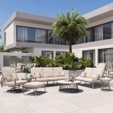 Laidback yet refined, the Tropitone Brasilia Collection introduces carefree comfort with sleek proportions for modern outdoor living. Its structured, yet open silhouette with gently rounded armrests and slightly reclined ladder-style back define its refined style. Each piece features a generous size frame made for everyday relaxation. The smart choice for any patio, deck or poolside, this versatile aluminum group includes lounges, sofas, loveseats, an ottoman and swivel action loungers. Customize with Tropitone’s exclusive all-weather fabrics and powder coat finishes.