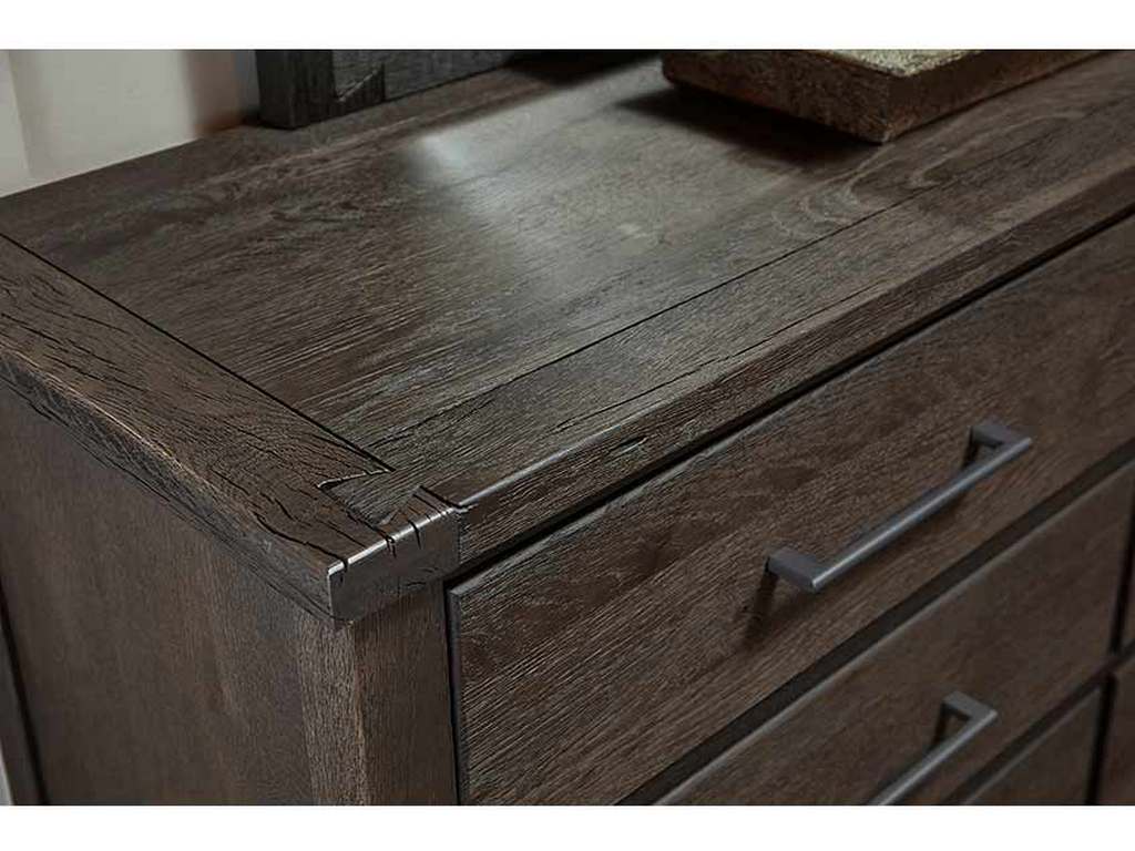 The Dovetail Collection's dominant design feature is the dovetail, a wood joinery technique dating back thousands of years which is displayed prominently near the top of each bed post, front top rim of each case piece, and all four corners of each mirror. This collection is designed for those who appreciate a natural reclaimed wood look. The splits, cracks, knots, and bold grain pattern is achieved through Accelerate the Aging Process technique. Until now only Mother Nature could make wood look this good