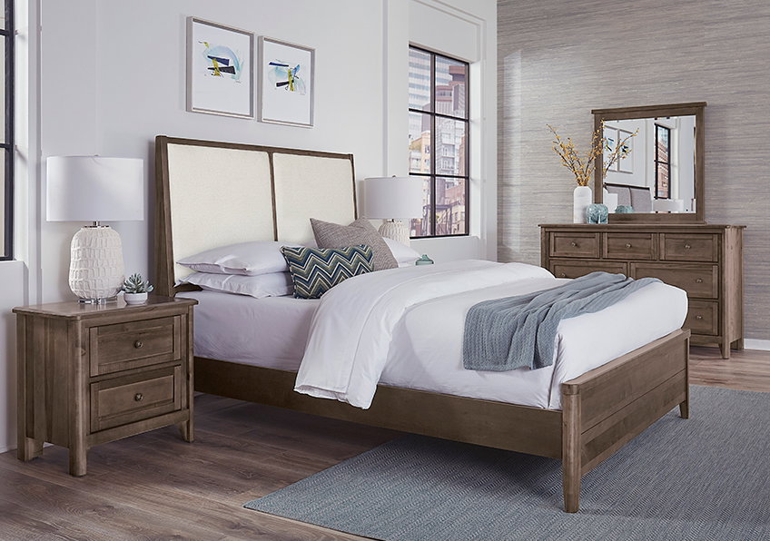Product Description: Vaughan Bassett 820-661-166-061-944-MS1 Woodbridge California King Upholstered Bed White Fabric Dark Cashmere Finish - Upholstered bed boast a refined classic look that will stand the test of time. Styled with simple lines; the canted headboard is slightly angled for comfort.