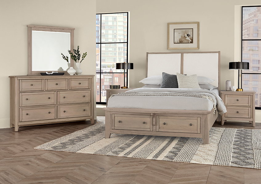 Vaughan Bassett 821-551-051-050B-502-555 Woodbridge Queen Upholstered Bed with Storage White Fabric Shadow Grey Finish