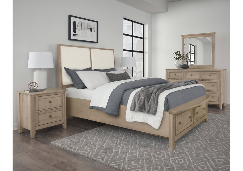 Vaughan Bassett 822-551-051-050B-502-555 Woodbridge Queen Upholstered Bed with Storage White Fabric Clear Maple Finish