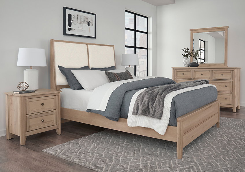 Vaughan Bassett Furniture Woodbridge Queen Upholstered Bed White Fabric Clear Maple Finish (SKU: 822-551-155-051-922) is available at Hickory Park Furniture in Hickory, NC and nationwide. We delivery anywhere.