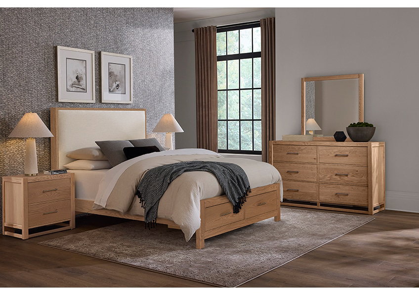 Introducing the Lodge & Loft bedroom collection from Vaughan-Bassett Furniture, a masterful blend of rustic lumber and modern lines, with every piece proudly made in the USA by American craftsmen and craftswomen. Each piece of Lodge & Loft features a blend of solid American Oak lumber and oak veneers. By using the finest American hardwoods, we are able to showcase the knots and bold grain patterns that are unique to white oak lumber, and which gives this bedroom collection an authentic, durable, and stylish feel.