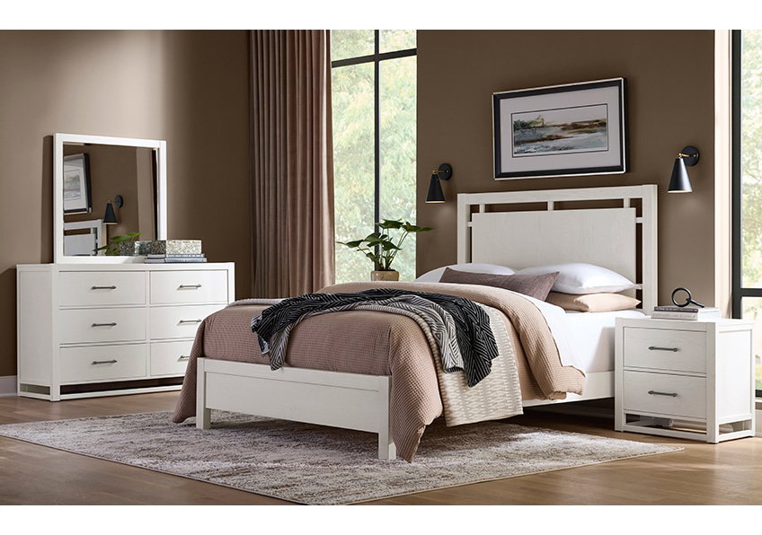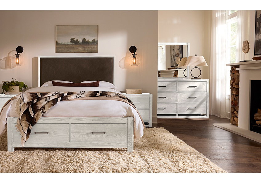 Introducing the Lodge & Loft bedroom collection from Vaughan-Bassett Furniture, a masterful blend of rustic lumber and modern lines, with every piece proudly made in the USA by American craftsmen and craftswomen. Each piece of Lodge & Loft features a blend of solid American Oak lumber and oak veneers. By using the finest American hardwoods, we are able to showcase the knots and bold grain patterns that are unique to white oak lumber, and which gives this bedroom collection an authentic, durable, and stylish feel.