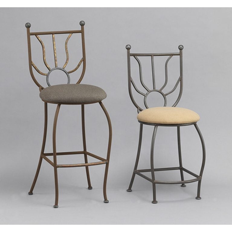 Product Description: Wesley Allen B224H30 Barstool Sunburst Barstool - Crafted from wrought iron with intricate sunburst design on the backrest. Features a swivel seat and footrest for added comfort. Ideal for kitchen islands or home bars. Sturdy and stylish addition to modern interiors.