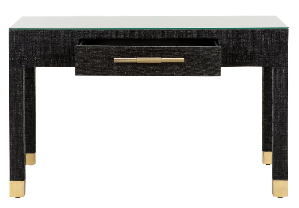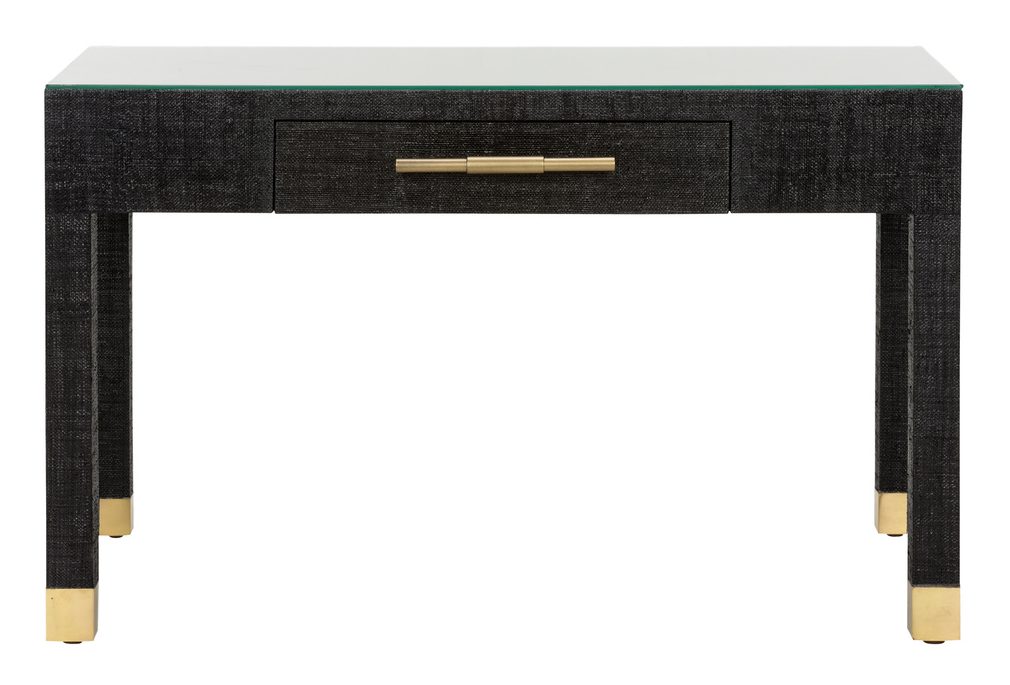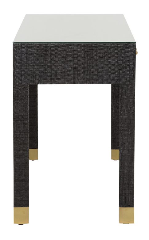 Product Description: Wildwood 295609 Sophisticate Console Table Black - Sophisticated yet functional, the sophisticate console table from the Cheryl Luckett collection for Wildwood is wrapped in black saguran adding style and texture to any space. Organize and store papers or trinkets in the drawer that features an antique brass handle and soft closing, full extension drawer slides. The tempered glass tabletop provides optimal space for displaying a lamp and your favorite decorative accents.