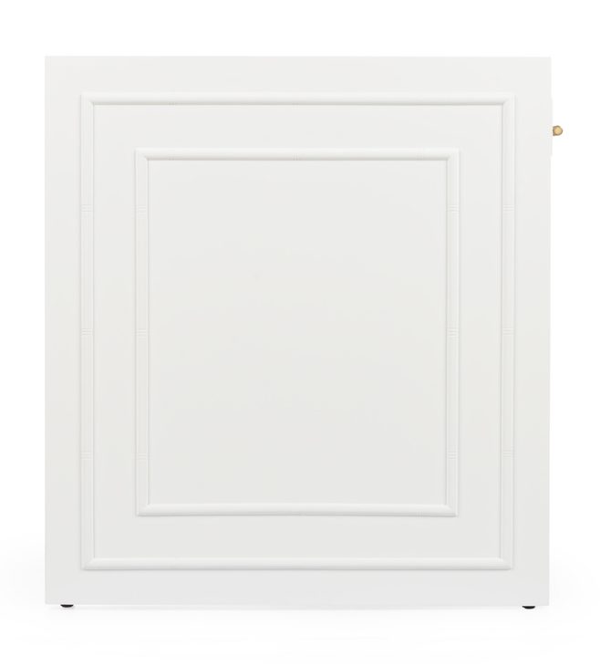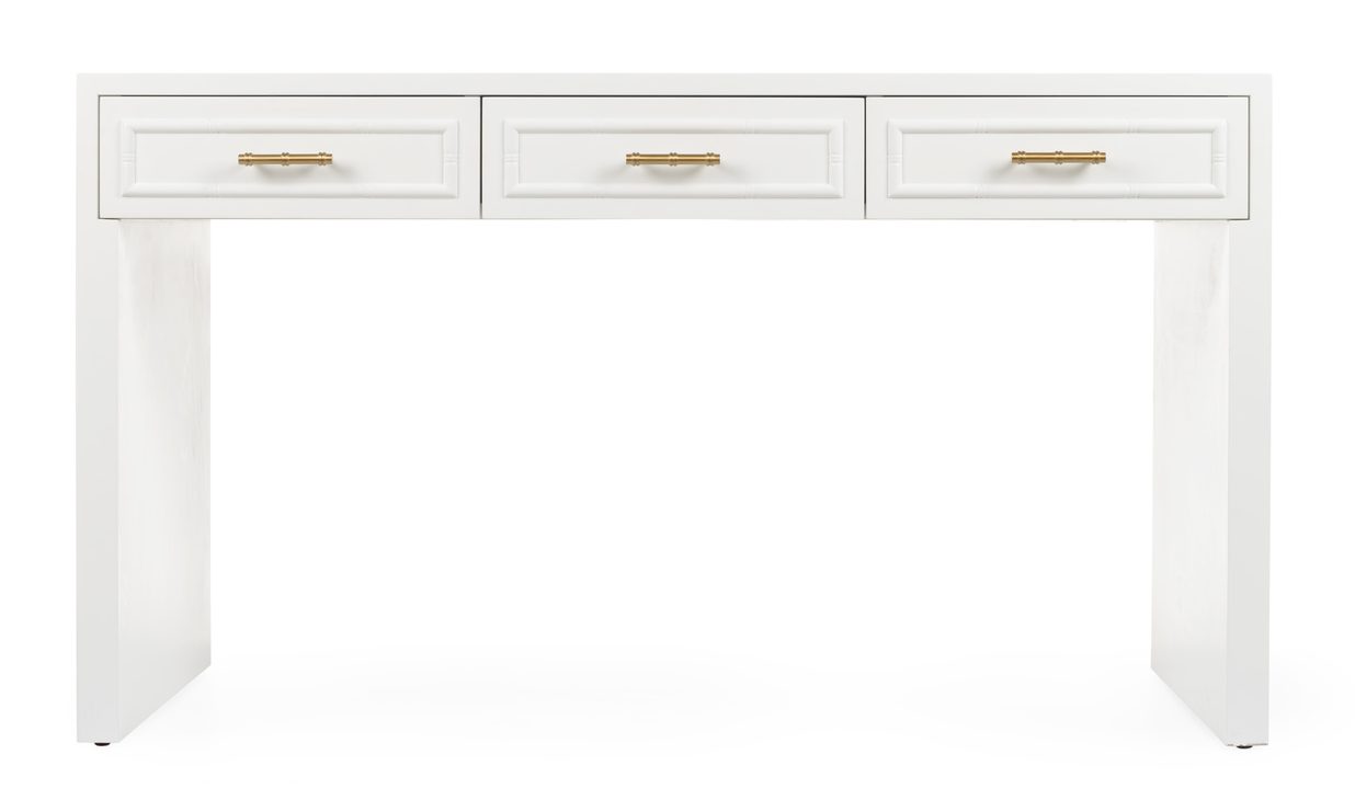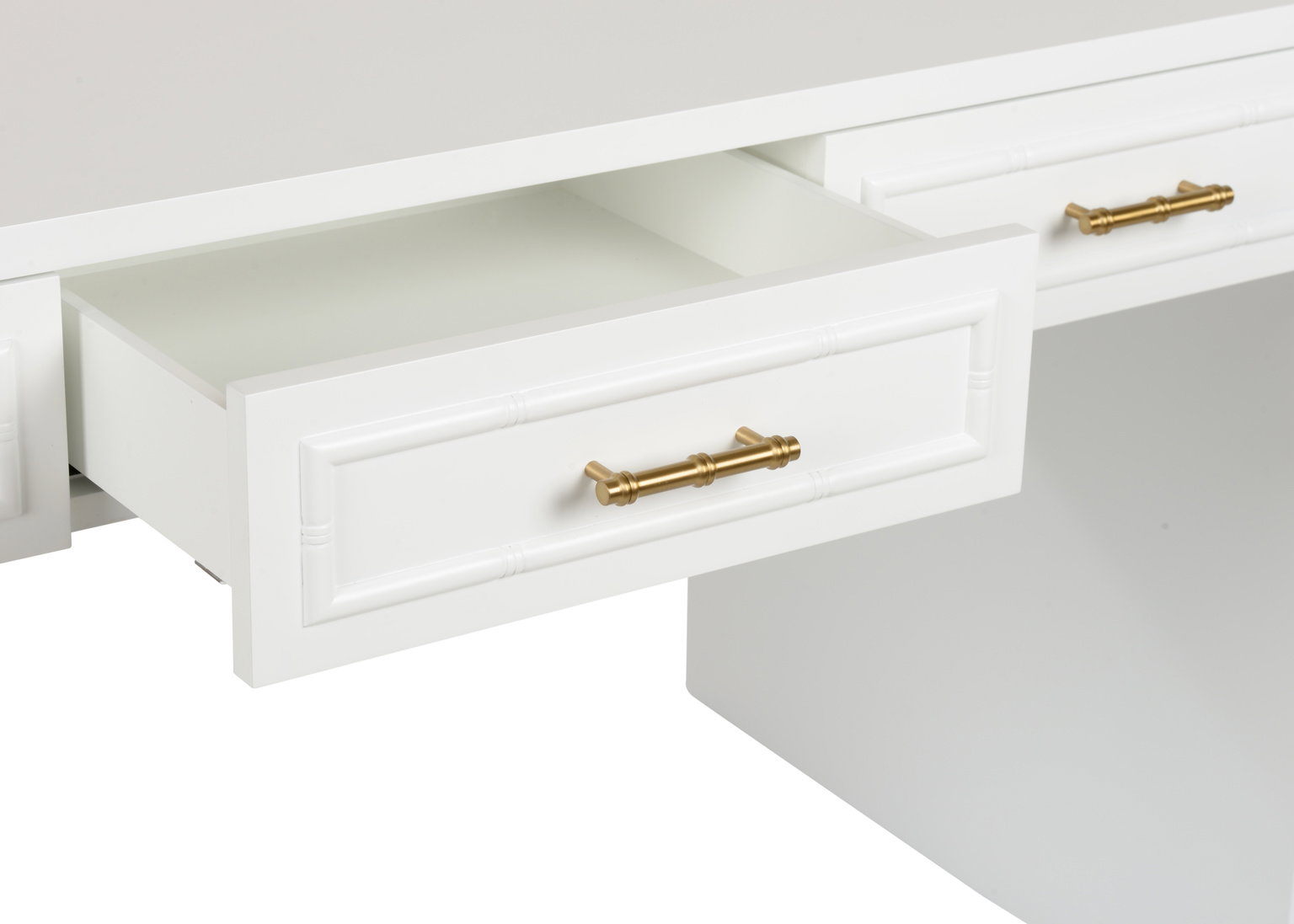 Product Description: Wildwood 400052-CUSTOM Bamboo Desk - Add an elegant touch to your home office with our bamboo writing desk. Crafted of acacia wood, this desk features three, soft closing, drawers with a raised bamboo design and brass finished bamboo pulls. Customize this desk to your existing office decor by selecting any Benjamin Moore paint color. Also available in nickel as an alternate hardware option. Please provide paint color name and number.
