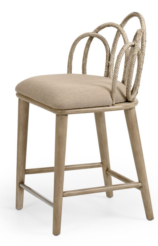Product Description: Wildwood 490223 Zoe Counter Stool - Ideal for a kitchen counter in your waterfront home, this light taupe rattan counter stool with upholstered seat has a casual feel. Boasting a unique seat design of woven rattan and interlocking curves, this stool is truly an impressive choice for your beach or lakefront home. Comes with nickel kickbar.