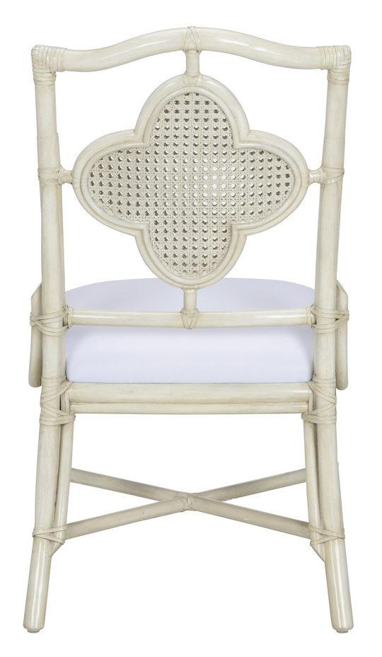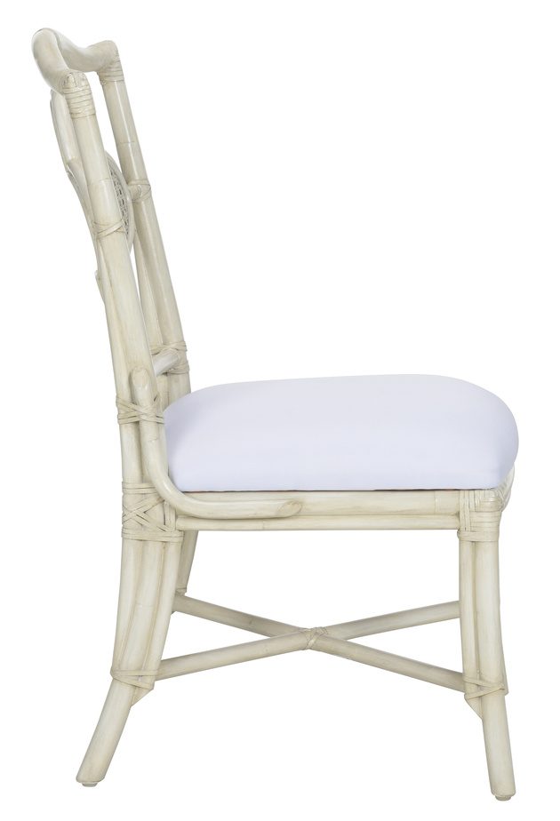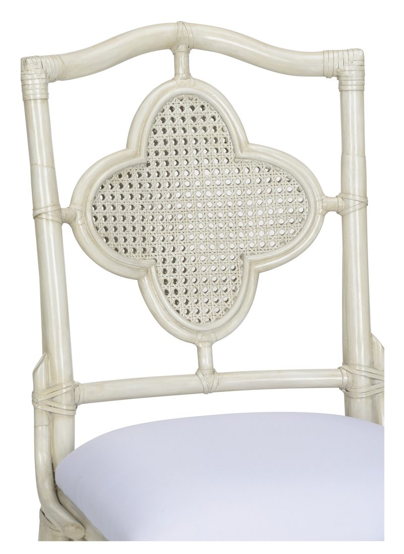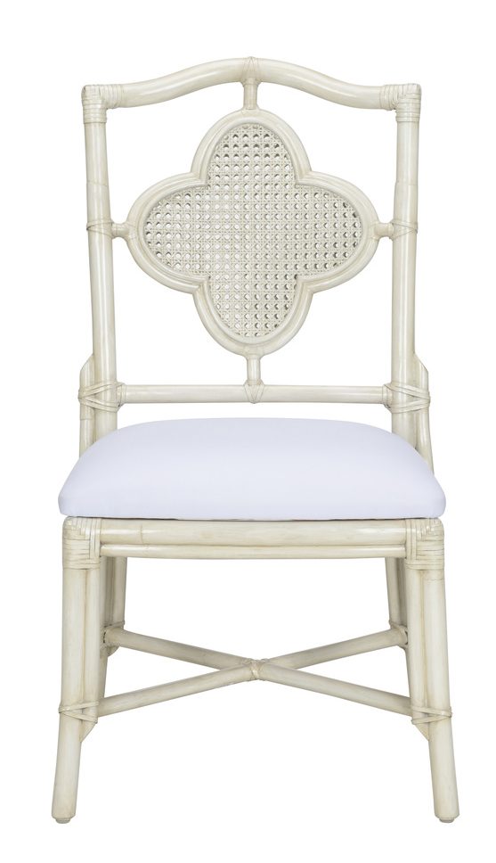 Product Description: Wildwood 490278 Selene Side Chair White - Designed with a clover shaped back that showcases the finely crafted woven cane, our Selene Side Chair exudes a vintage coastal vibe. The natural rattan pole frame supports a foam cushion covered in a soft gray chenille. May be paired with the Boca Game Table (490277) for a fun family game night.