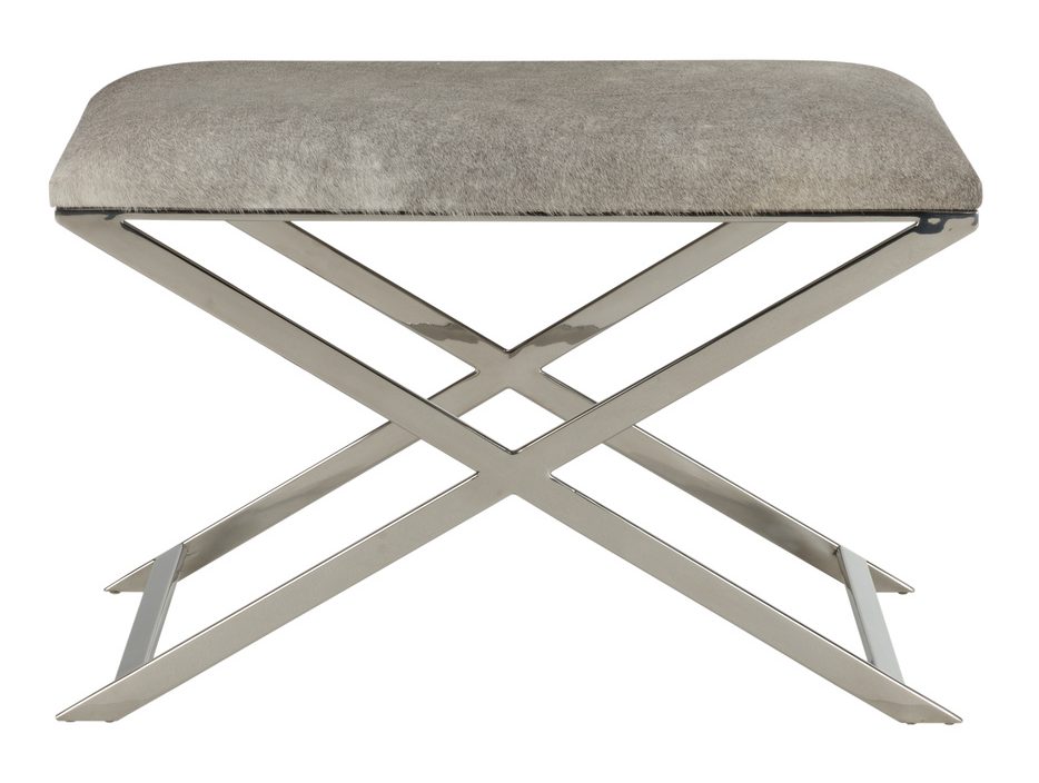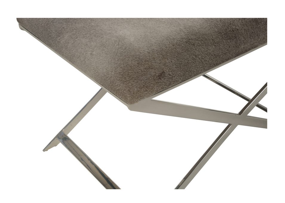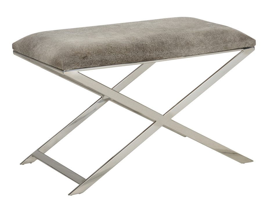 Product Description: Wildwood 490484 Sitting Pretty Stool - The sitting pretty stool has a polished nickel x design base with a neutral gray hair on hide seat. The blend of finishes makes this stool just right for a rustic modern vanity or extra seating in a family room in front of the fireplace.