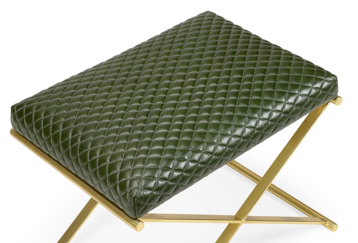 Product Description: Wildwood 490485 Garrett Leather Stool - The Garrett Leather Stool has a polished brass "X" base and a green leather seat. The seat has a crisscross pattern repeating the design of the base. This stool is the right size for a vanity or extra seating in a family room.