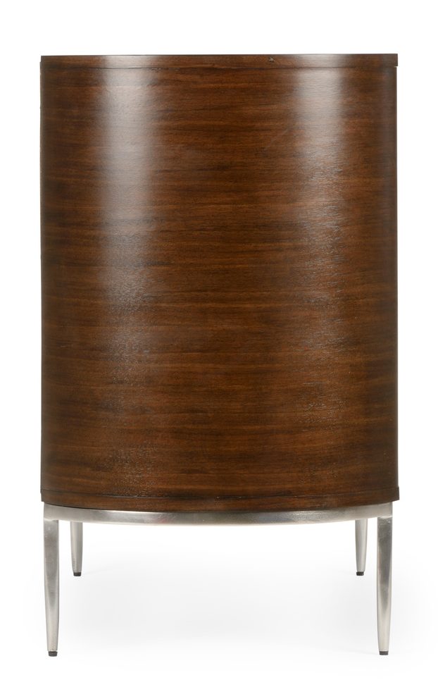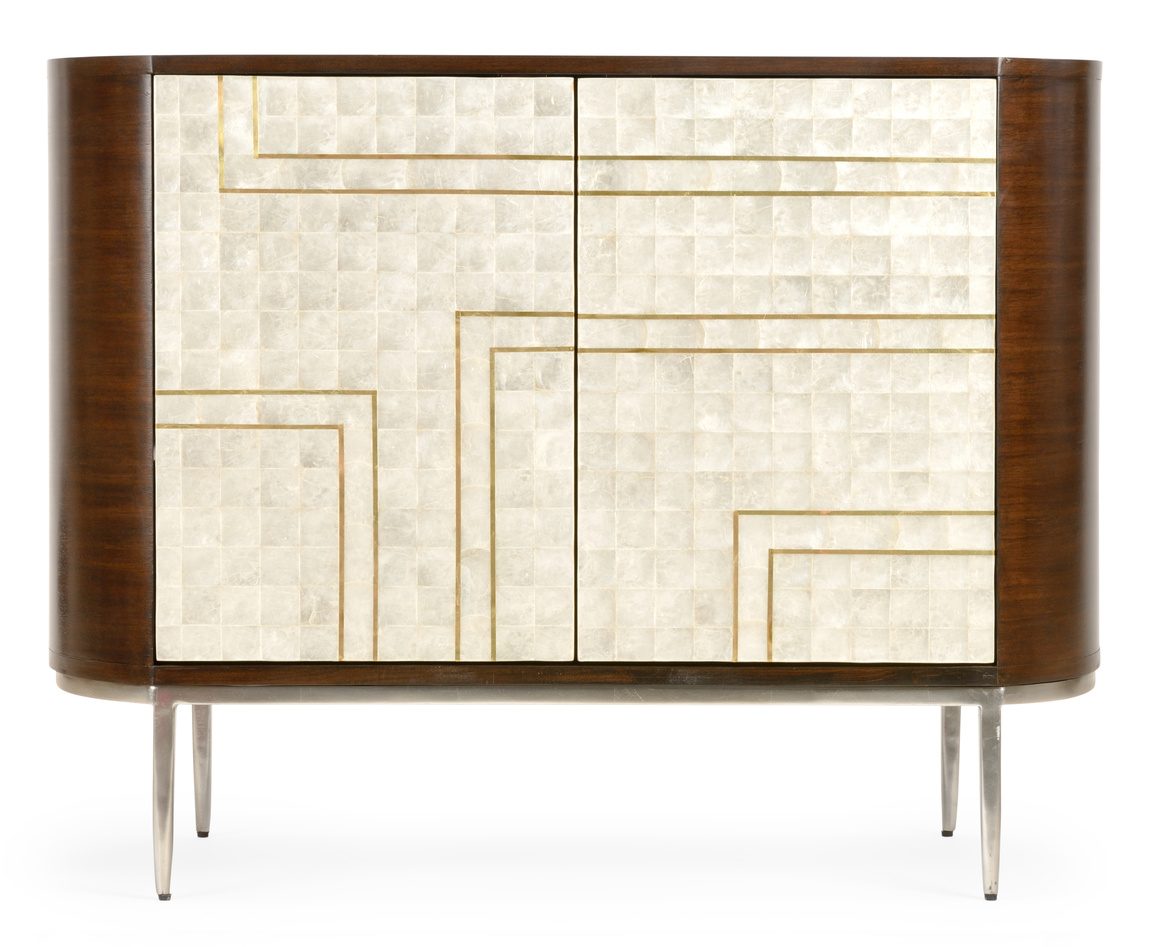 Product Description: Wildwood 490571 Shelldon Bar Cabinet - Shelldon Bar Cabinet has an exquisite mahogany finish with two doors featuring natural white Capiz shells and antique brass inlay. Inside features include two racks for holding wine glasses, eight bottle holders, a shelf for mixing cocktails and a drawer for holding your napkins and other bar accessories. This modern design would make a lovely addition to a home or office.