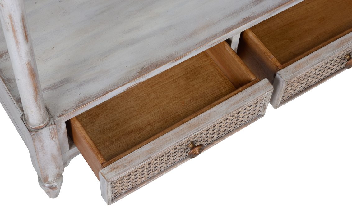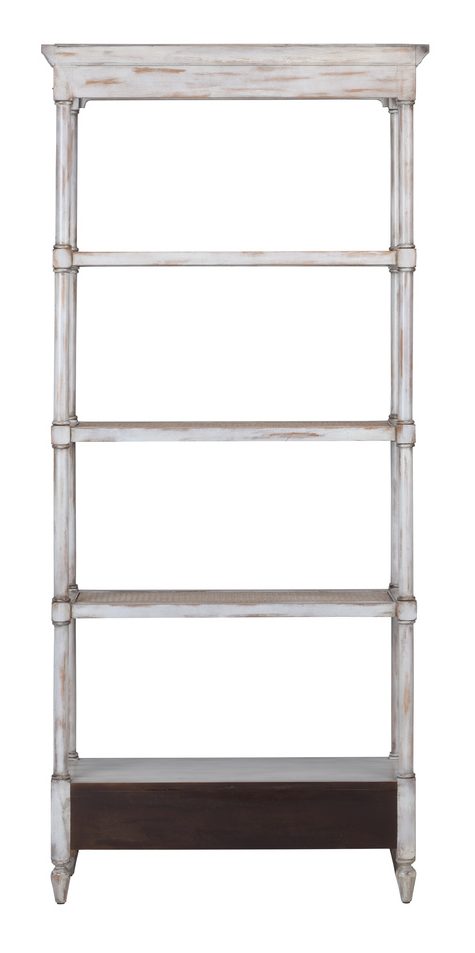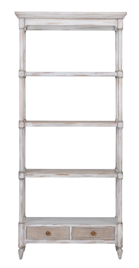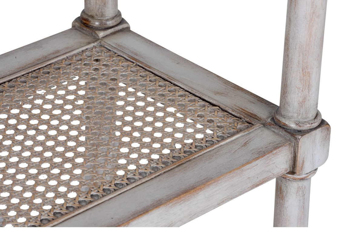 Product Description: Wildwood 490617 Summer House Etagere - Perfectly suited for displaying your favorite decorative accessory, summer house etagere is crafted of solid Gmelina Arborea with woven cane for a textural twist. Four tiers and two drawers provide ample space for photos, books, plants and more. The gray washed finish provides subtle sophistication in a traditional or waterfront decor.