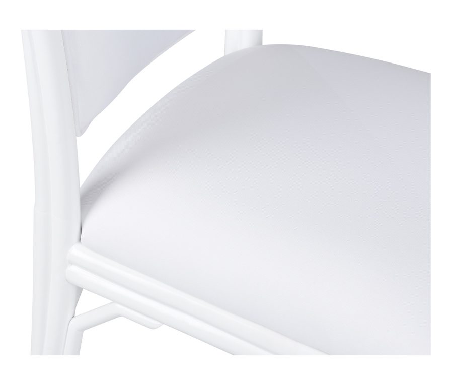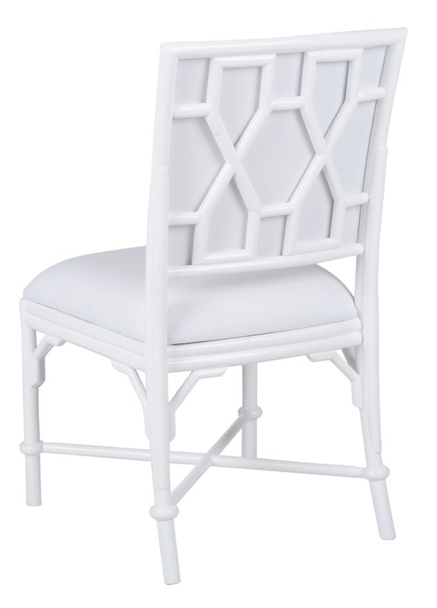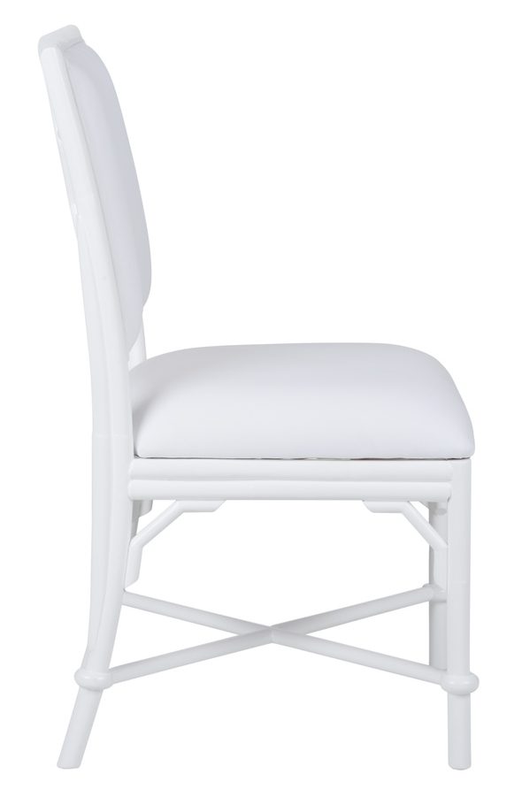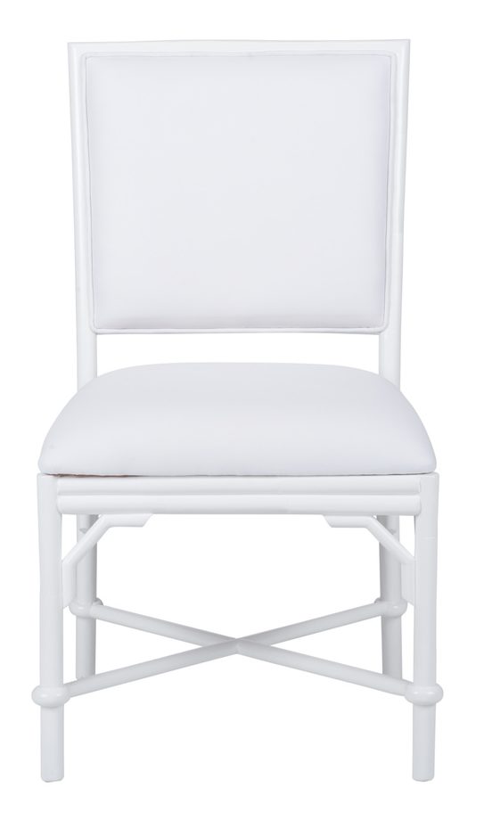 Product Description: Wildwood 490654 Ella Side Chair White - Complete your dining table with our Ella Side Chair. Crafted of white rattan, this chair comes with an off-white muslin padded cushion for comfort. A geometric pattern on the back of the seat creates visual interest and exhibits stunning craftmanship. This chair will blend with any decorative style.
