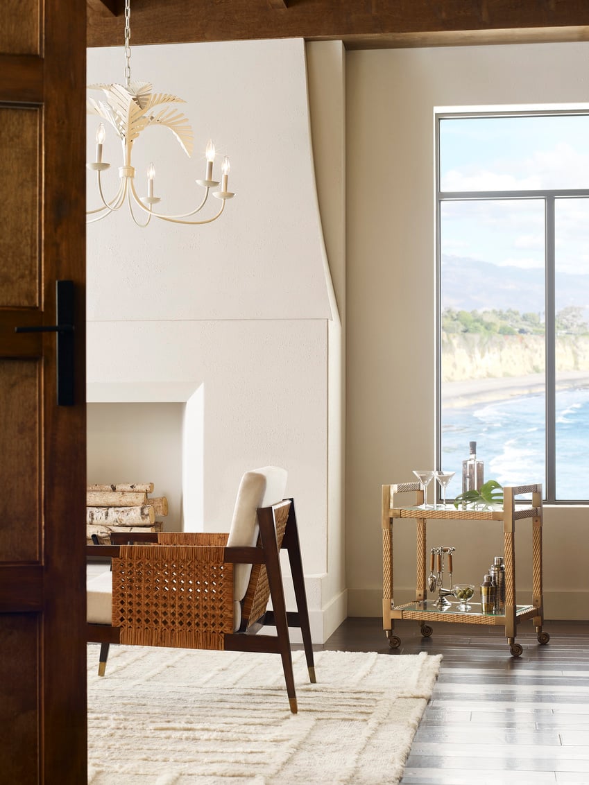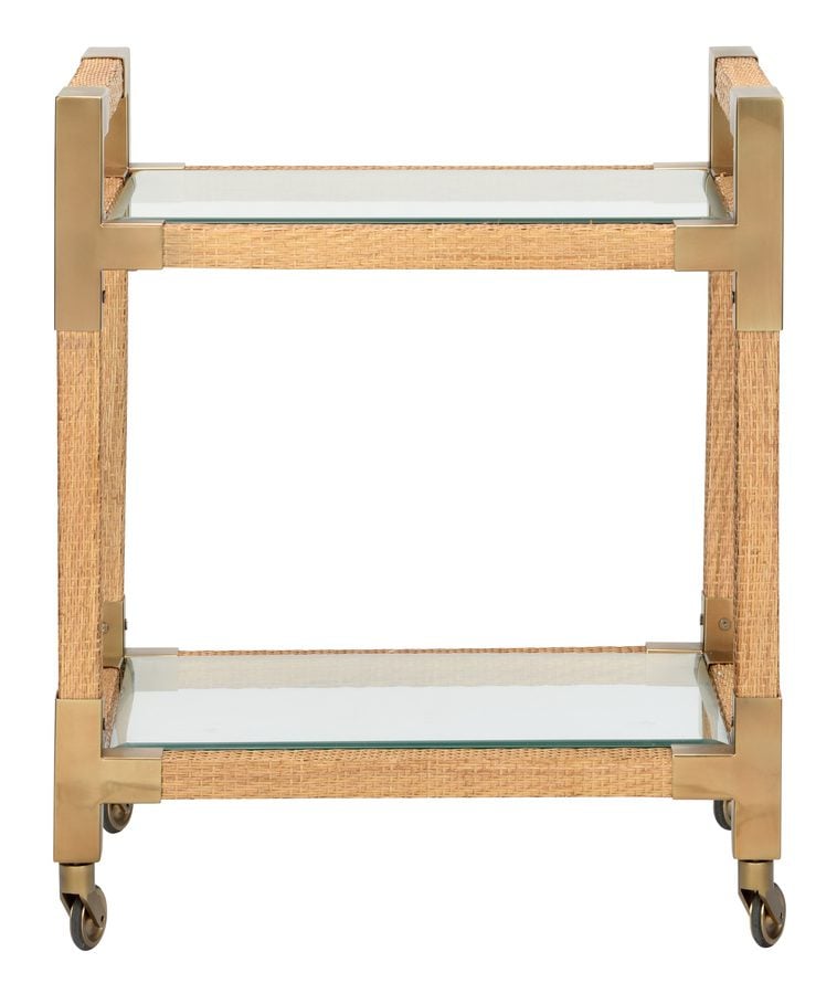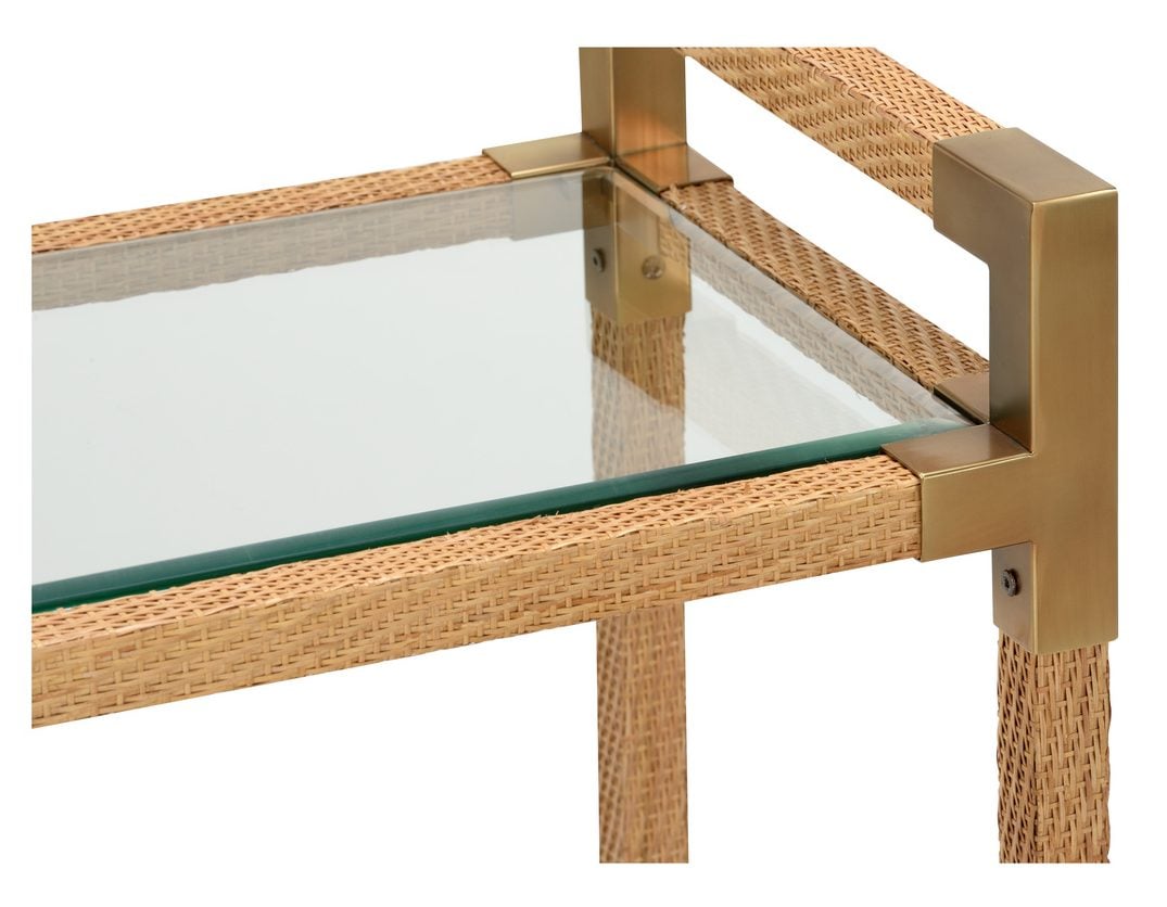Product Description: Wildwood 490677 Vieux Carre Bar Cart - Move the party from room to room with our Vieux Carre Bar Cart. Featuring natural, woven cane with bronze corner brackets, its two glass shelves hold bottles, glassware, your favorite decorative accents and more. Casters allow you to transport snacks with ease. Reflect your modern, coastal style by displaying this versatile piece in a kitchen, home bar or entertaining area.