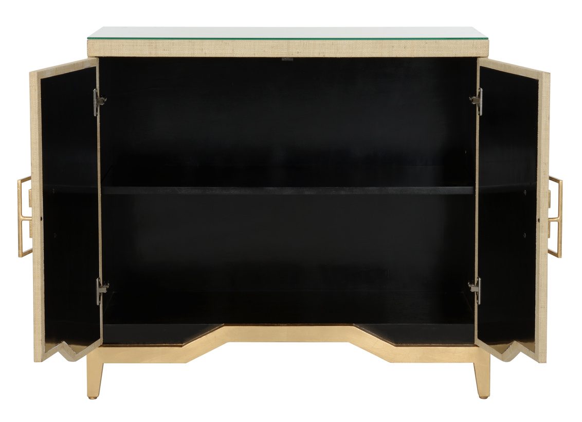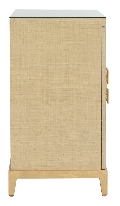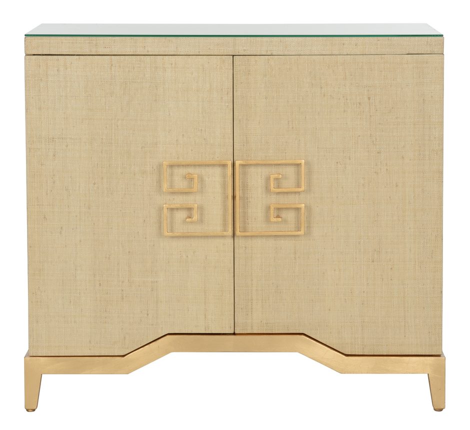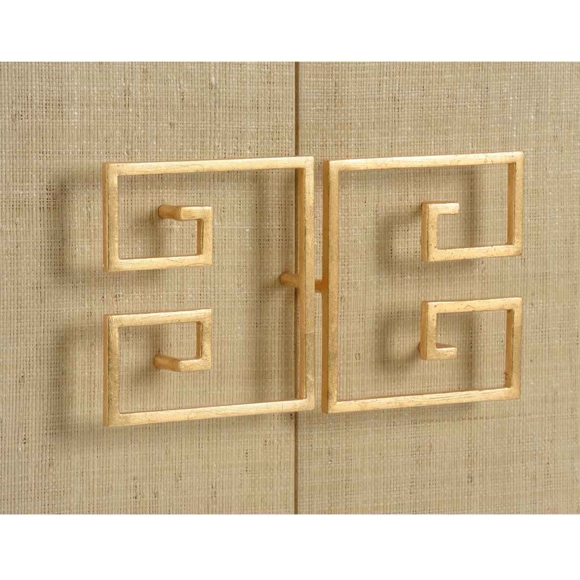 Product Description: Wildwood 490746 Vanessa Chest - Vanessa Chest combines modern design with classic detailing. This two-door cabinet is wrapped in natural woven raffia highlighted by an exquisite gold leaf base and Greek key pulls.