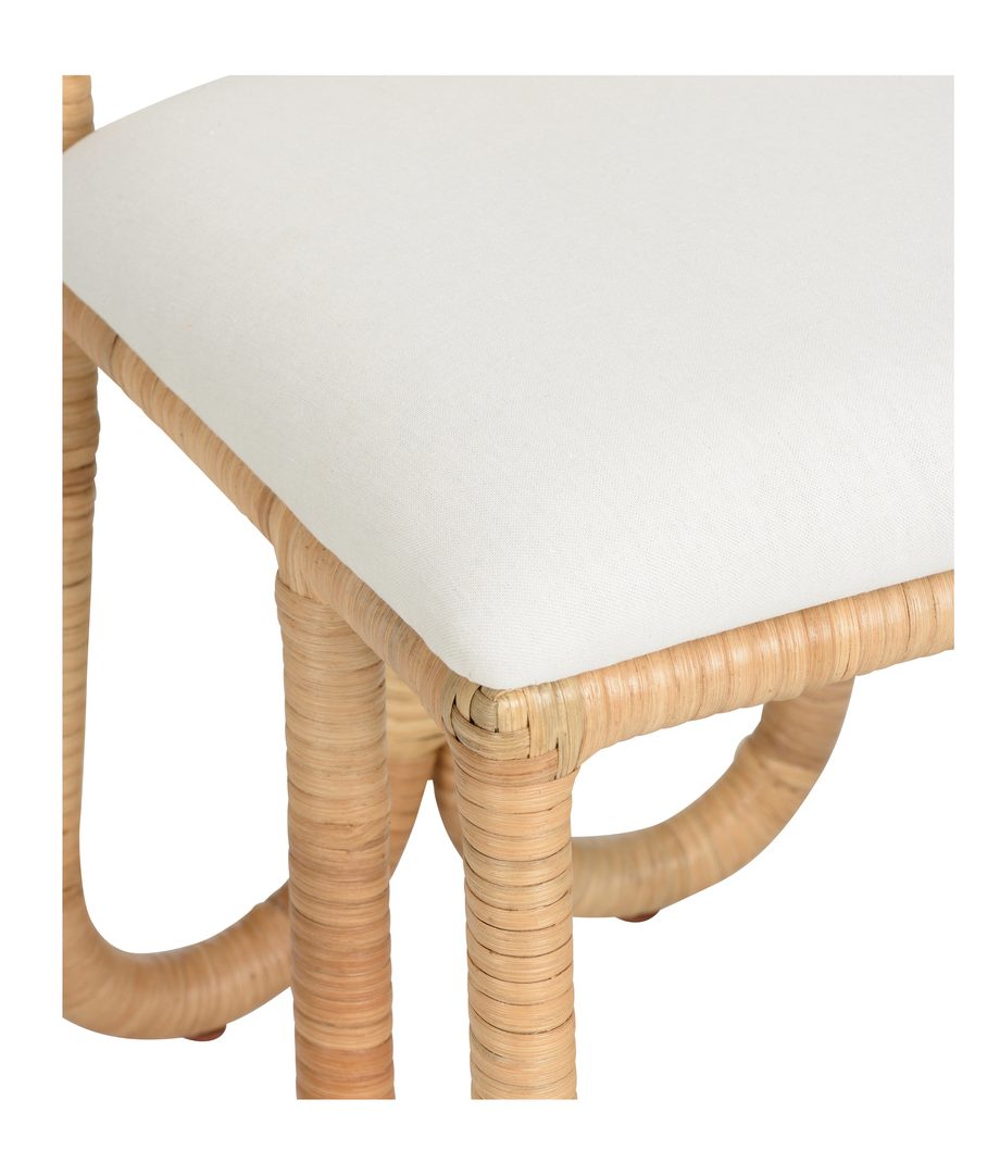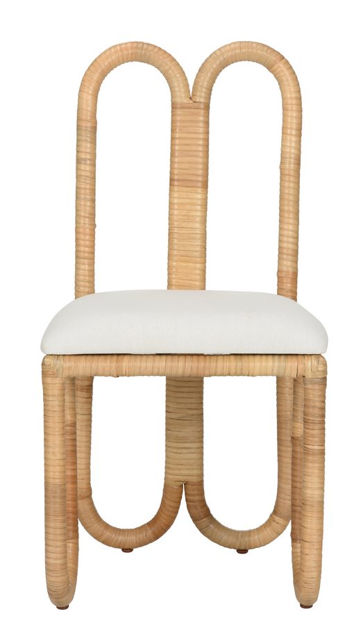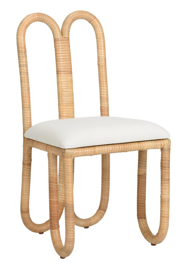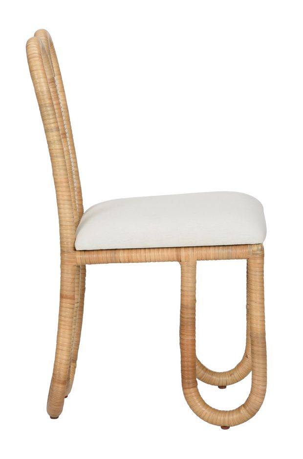 Product Description: Wildwood 490776 Cuixmala Dining Chair - The Cuixmala Dining Chair brings a touch of tropical elegance to your space with its airy, natural design. The unique looped backrest and legs are expertly crafted from woven rattan, offering both durability and style. Paired with a plush, cushioned seat, this chair provides comfortable seating with a relaxed, coastal vibe.