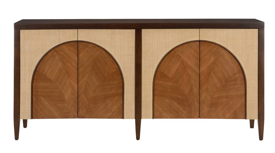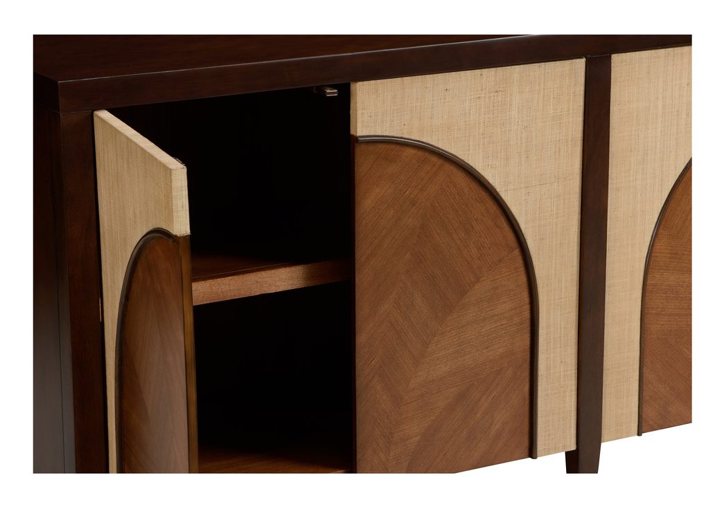 Product Description: Wildwood 490787 Honopu Cabinet - The Honopu Cabinet proves that a thoughtful mix of materials reimagines a traditional storage piece into a masterpiece. A textural arch-shaped wood inlay against a raffia façade is a rich detail that makes strong graphic impact. Four spacious interior shelves render it endlessly versatile.