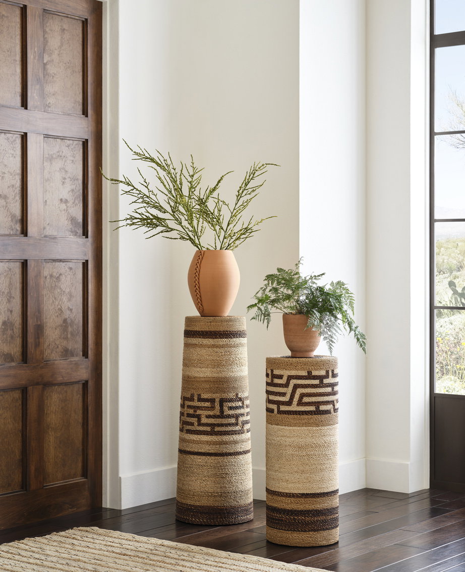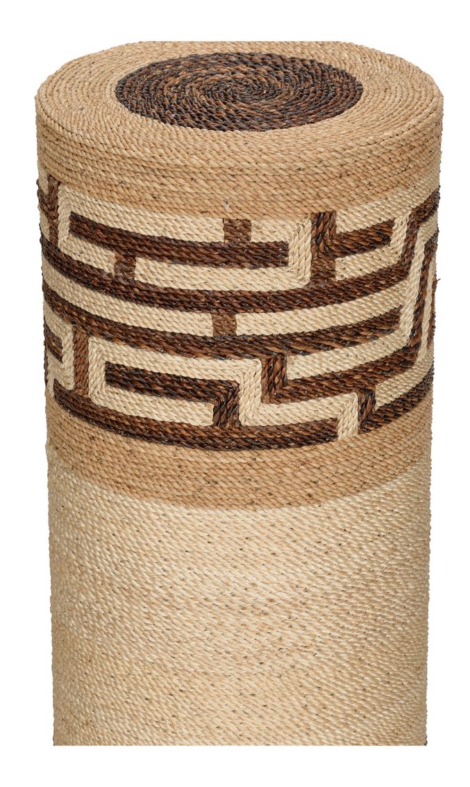 Product Description: Wildwood 490816 Calusa Pedestal I - Made of a wooden column wrapped in dyed abaca rope, the Calusa Pedestal I is the perfect place for a plant or sculpture, or used as a drinks table. The superimposed maze patterns and contrasting colors of jute make this an eye catching piece. Pairs well with Calusa Pedestal II.