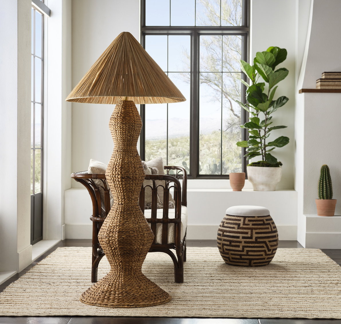 Product Description: Wildwood 490819 Calusa Stool - Introducing the Calusa Stool - dyed abaca rope wraps the rounded frame to create an eye-catching maze pattern. Topped with an upholstered cushion, this pouf can serve as a seat or an ottoman in any space craving an organic element.
