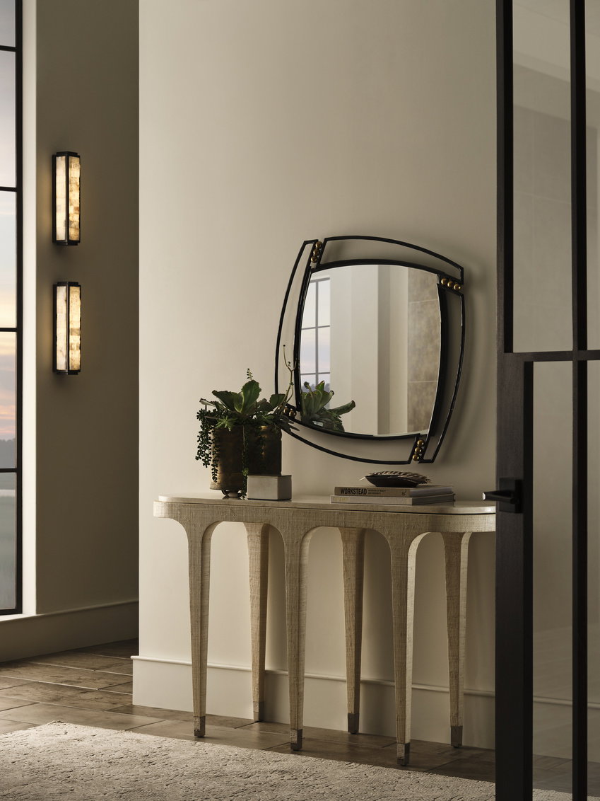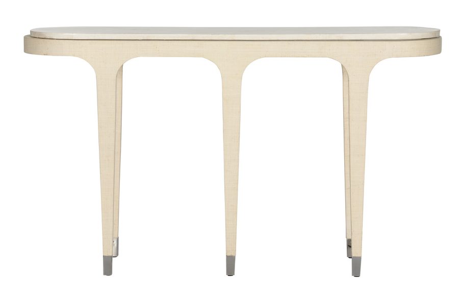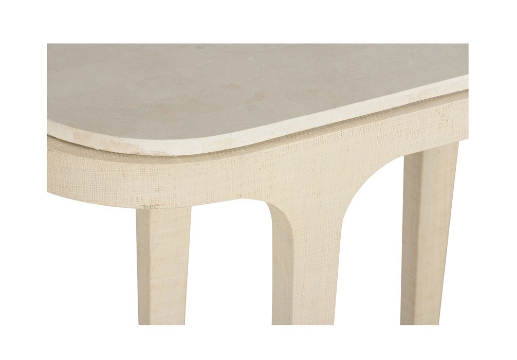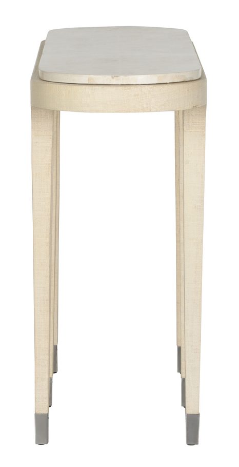Product Description: Wildwood 490841 Juno Beach Console - The dainty Juno Beach Console Table exudes understated elegance with its finely wrapped grasscloth finish. The textured base is perfectly complemented by a smooth stone top, creating a sophisticated contrast of natural and refined elements. Delicate nickel accents add a touch of modern glamour, enhancing the table’s timeless appeal. Ideal for smaller spaces or as a statement piece in an entryway, this console table blends organic materials with sleek details for a harmonious and chic aesthetic.