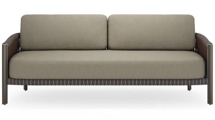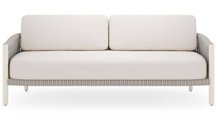 Product Description: Woodard S790031 Eve Sofa - Sofa upholstered in outdoor fabric with plush cushions and a sturdy aluminum frame. Features a sleek design with clean lines and a comfortable seat. Ideal for outdoor lounging spaces.
